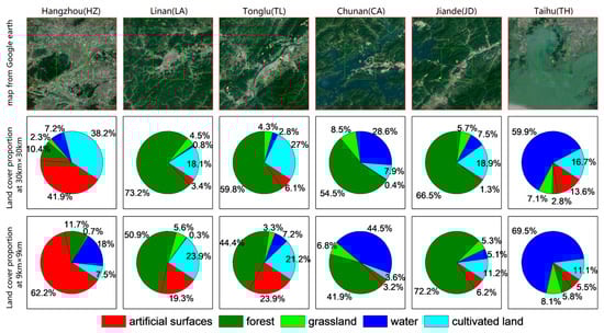 The land cover maps over the six ground sites during 2010 were obtained from the GlobeLand30 product (http://www.globallandcover.com, accessed on 21 October 2020), which has a spatial resolution of 30 m and an overall reported accuracy above 80% []. Five land cover types surround the ground sites: artificial surface (or urbanized area), forest, grassland, water, and cultivated land. Specifically, the land cover of four of the stations (LA, TL, CA, and JD) is dominated by vegetated areas, accounting for 50% of both the 9 km × 9 km and 30 km × 30 km boxes. In contrast, the HZ site is located in an urbanized area, and the TH site is close to water, and artificial surface features and water account for the most coverage in the selected windows centered over these stations. Indeed, the land cover proportions of urbanized features and water (LCP_UW) represent 10~80% of the total coverage within the windows, and such a large dynamic range makes it possible to analyze the impacts of LCP_UW on the accuracy of MODIS AOD retrievals.