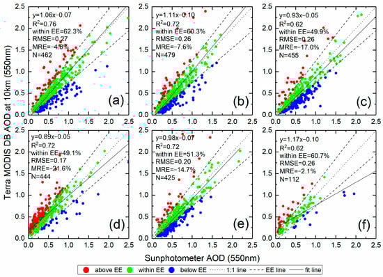 where and represent the collocated MODIS and ground-derived AOD retrievals and and represent the means of the MODIS and in situ AOD retrievals, respectively. The EE defined in this study is the target accuracy of the MODIS 3 km AOD product [], which is the least restrictive among the three MODIS AOD products. The percentages of MODIS AOD retrievals that fall above, within, and below the EE envelope are calculated by Equations (7)–(9).