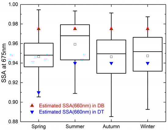To further investigate the impact of aerosol type on the accuracies of the MODIS AOD retrievals, we compared the magnitudes of single-scattering albedo (SSA) between MODIS observations and AERONET measurements. SSA is a ratio between scattering and total extinction, ranging from 0 (purely absorbing aerosols) to 1 (purely scattering aerosols). Figure 11 shows the climatological seasonal SSA (675 nm) values derived from AERONET measurements at the TH site from 2005 to 2016. With mean SSA values of ~0.96 in the summer and ~0.95 in other seasons, the study region appeared to be dominated by nonabsorbing or weakly absorbing aerosols. Obviously, the SSA tends to be underestimated in the DT algorithm (especially in spring) and overestimated in the DB algorithm (see Figure 11), leading to the overestimation of DT AOD and underestimation of DB AOD []. Such comparison could also partially explain the systematic overestimation or underestimation of MODIS AOD retrievals, as shown in Figure 4, Figure 5 and Figure 6.