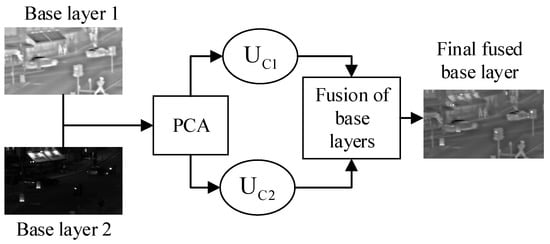 The block diagram for a fusion of base layers by PCA method is shown in Figure 4. The two base layers that are decomposed by AD are fed to PCA and the final fused base layer is obtained after the fusion process of PCA. The symbols and in Figure 4 represent the uncorrelated components for both base layers. These uncorrelated components are obtained from the highest eigenvalues and eigenvectors that are orthogonal to each other, and its computation would be fast due to the elimination of redundant data.