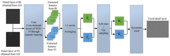 - The resultant detailed parts are fed to four convolutional layers of the VGG-19 network through transfer learning to extract the multi-layer features. Afterward, and averaging-based fusion strategies along with the max selection rule are applied to obtain the fused detail contents.
