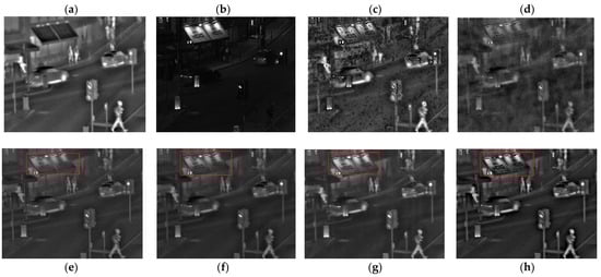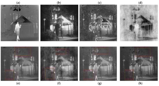 Street view: (a) IR image; (b) VI image; (c) CBF; (d) DCT; (e) improved DWT; (f) CSR; (g) LatLRR; and (h) proposed method.