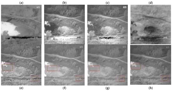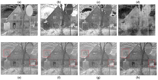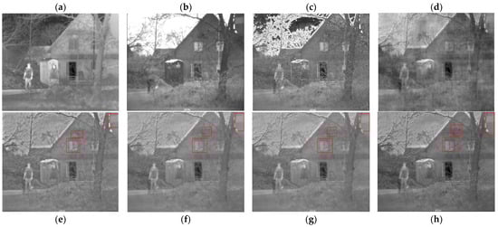 The CFB method in Figure 7c contains more artificial noise points, and the significant features are not obvious. Its visual effect is poor compared with other fusion methods. The fused image obtained by the DCT method has the presence of gradient reversal artifacts. In addition, the details are fuzzy, and there are numerous artificial edges and contours in the whole image. The fused images obtained by the CSR and LatLRR methods almost look similar. They have fewer artifacts and noise, resulting in a more informative image. They restore the thermal objects with more details, but they lose some spatial details such as small windows, and other details are not very clear, as can be seen in the red boxes. The fused image obtained by the DWT method captures more salient features from both source images. On the other side, there is a large amount of additional structure around the prominent targets, which is not present in the source images but is introduced by noise, resulting in a distorted image. It can be seen in Figure 7h that the proposed method preserves whole energy information due to the unique characteristics of PCA because it transforms the correlated variable into an uncorrelated form that chooses those features which have significant values of eigenvalues and eigenvectors . In addition, the fused image restores more contrast, structural information, smooth patterns, and contours.