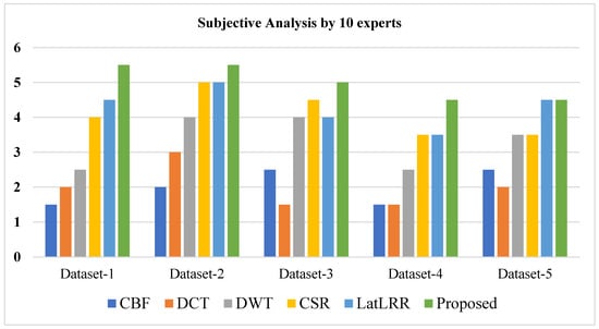 All in all, from a visual perspective, it can be observed from Figure 6, Figure 7, Figure 8, Figure 9, Figure 10 and Figure 11, and experts ranking in Table 2 and Figure 12, that the proposed method produced a better quality fused image than the other fusion methods, demonstrating the supremacy of our method. Similarly, the proposed method has better values in the indexes of , , , EN, , and objective evaluation assessment that further justify the dominancy of the proposed work.