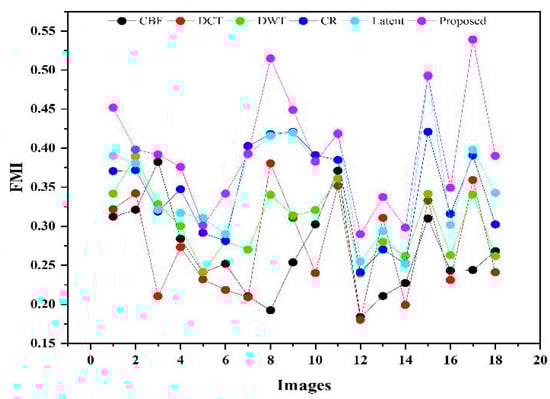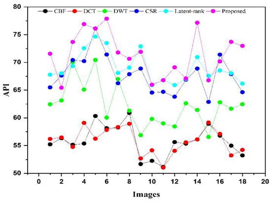 We performed fusion on 18 test images, and their average values of FMI, , API, EN, , and are presented in Table 5. Due to space limitations, we provided the average values for all mentioned parameters. In addition, we also provided a line graph and scattering plot in Figure 13, Figure 14, Figure 15, Figure 16, Figure 17 and Figure 18, respectively. The primary purpose of using the two different graphs is for ease of comprehension.