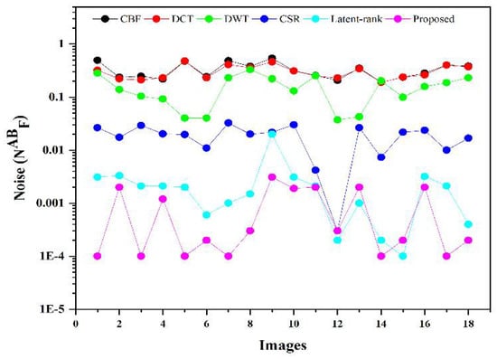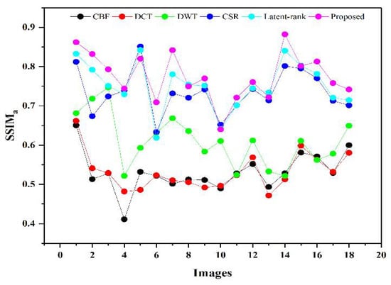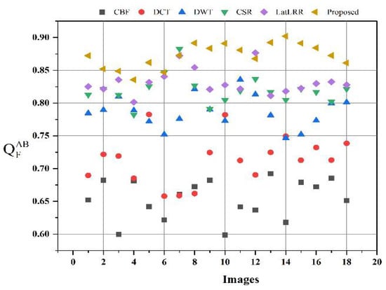 The larger values of , , EN, and result in a good quality fused image with more salient features from both source images, while the smaller values correspond to a fused image with less similar structure. On the contrary, the fused image will have less artifacts and noise if the value of is smaller, while the higher value results in a fused image with more artifacts and noise. The larger values for , , , EN, , and the smaller values of are written in bold letters in Table 4 for differentiation purposes. It can be observed in Table 4 and Figure 13 that CBF and DCT have fewer values for , which means the fused image restores less salient features from source images. The improved DWT produces better results than CBF and DCT; however, the CSR and latent-based methods achieve better results than DWT. The proposed method outperforms all other methods that acquire a better quality fused image with more salient features. Similarly, it can be observed in Table 4, Figure 14 and Figure 15, that the proposed method achieves significant values for and which shows the optimal fusion performance compared with other methods by retaining more structure and contrast from the source images. Compared with other methods, the latent-based method’s performance is better than the other three methods, whereas the CSR values are closer to the latent-based method.