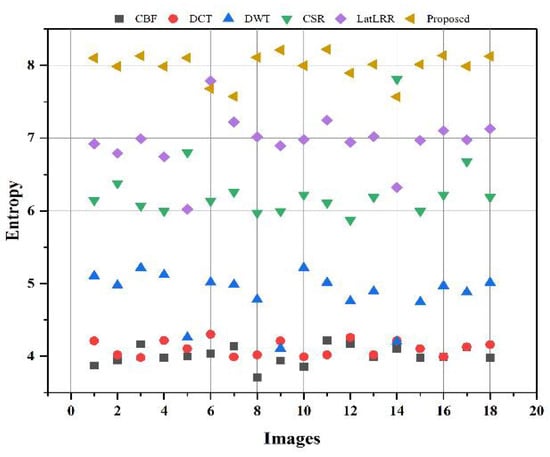 Similarly, it can be seen in Table 4, Figure 17 and Figure 18, that the proposed method has higher values for EN and than the other methods. The yellow triangles indicate the proposed method in scattering plotting in Figure 17 and Figure 18. It can be seen that the proposed method achieves higher values for EN except for a few images. Moreover, the CBF (square boxes) and DCT methods (circle boxes) in Figure 17 and Figure 18 produce poorer results than all other methods. Furthermore, it can be observed from Table 4 and Figure 16 that the proposed method has significantly fewer values of , which proves that the fused images have fewer artifacts and noise than other methods. In this regard, it can be concluded that the proposed method produces better visual results and obtains better values for objective evaluation analysis, demonstrating the supremacy of the proposed method.