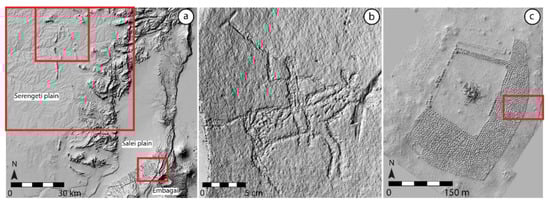 The three DEMs, all processed with analytical hill-shading. Red rectangles indicate specific zones studied. (a) DEM of study area in Tanzania. (b) DEM of rock art representing a rider, Shalabolino, Siberia. (c) DEM of funeral structure, Urt Bulag 2, Mongolia.