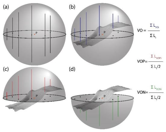 A line-based strategy is used to approximate these volumes [23]. Segments run perpendicular to the horizon from the landform surface to their intersections with the sphere (Figure 2). Segment lengths are summed for the targeted part: ΣLVOi for VO (Figure 2b), ΣLVOPi for VOP (Figure 2c), and ΣLVONi for VON (Figure 2d). These approximated volumes are normalized using that of the entire sphere (using ΣLi) for VO, and that of a hemisphere (using ½ ΣLi) for VOP and VON. Note that VO is linked to VOP and VON by: