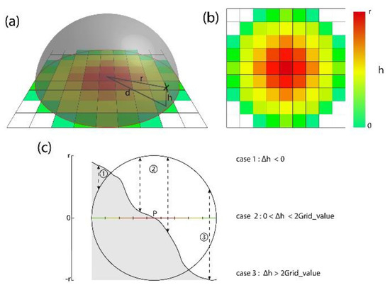 The raster format of DEMs is well adapted to line-based volume approximation as each pixel can be used as the starting point to compute a segment length. The first step is to define a grid where each pixel within a circle of radius r (Figure 3a) contains the value of the zenith altitude of the hemisphere, h, taking into account the DEM resolution. This grid becomes the reference for segment length calculation in the following (Figure 3b). Consider now the case of any point, P, in a DEM for VO calculation: the second step is to shift the DEM, such that the altitude at P becomes 0 (Figure 3c). The altitude of each pixel of the DEM around P is then subtracted from the altitude of the corresponding pixel in the reference grid (Grid_value) to obtain the altitude of the sphere located above the relief. If that difference, Δh, is negative (case 1 in Figure 3c), the relief is above the sphere, and the new pixel value is therefore set to 0. When the difference is positive, but less than twice that of the Grid_value (case 2 in Figure 3c), then the new pixel value becomes Δh. Finally, if Δh exceeds twice the value of the grid, the relief is below the sphere (case 3 in Figure 3c), and the new pixel value is set at twice that of the Grid_value. These new values correspond to the LVOi used to compute the value of VO for the point P. This process is repeated for each DEM pixel. Both VOP and VON are computed following the same principles. The only difference between VO and VOP is that Δh is compared to Grid_value, instead of 2 × Grid_value. For VON, the subtraction is reversed, thus calculating segment lengths from below the landform.