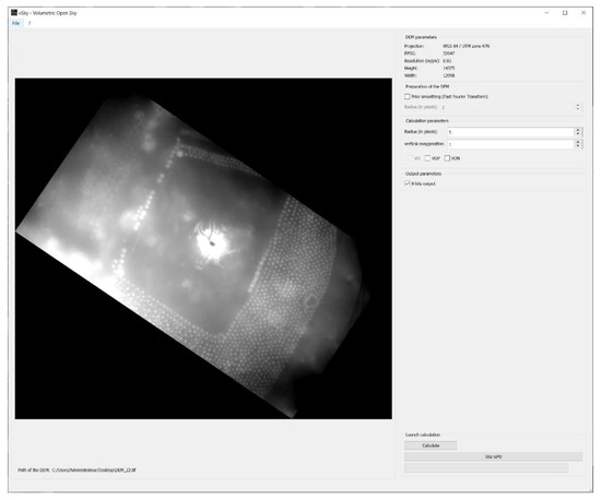 The three methods presented above were implemented in Python, provided here as an open-source script (SM1), as a standalone executable program for Windows (SM2), and as a QGIS 3.X plugin (SM2). The vSky program uses the following Python libraries: PyQT 5.9.2, Numpy 1.16.4, Pillow 6.1.0, Scipy 1.2.1, Cupy 6.0.0, and Gdal 3.0.2. This code allows any projected DEM to be loaded and processed, provided that the resolution is the same in X and Y. Three parameters are tunable: the radius of the sphere and/or hemisphere influence, the strength of smoothing (which is obtained by applying a Gaussian kernel and fast Fourier transform convolution), and the vertical exaggeration (Figure 4). Smoothing and vertical exaggeration optionally pre-process the DEM. The first reduces aliasing and noise by attenuating high-frequency relief, while vertical exaggeration applies a multiplying factor to the altitude, exaggerating or attenuating variations in relief. Vertical exaggeration is often used in combination with analytical hill-shading to adjust the visual aspect. After calculation, results are saved as georeferenced raw data rasters, optionally together with an 8-bit version for each of the three treatments, and an RGB three-channel image combining VO, VOP, and VON. The 8-bit images are produced after linear and saturation stretching within a 2nd–98th percentile interval. In this process, the outputs ϵ [0,1] are remapped to fit the 0–255 range for grayscale rendering. These simplified additional outputs are produced for rapid visual inspection; any further calculation from this documentation should therefore be avoided.