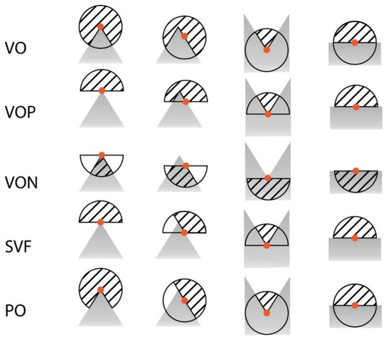 Sketches where hatching depicts the zones taken into account by the VO, VOP, VON, SVF, and PO methods, applied to different topographic cases.