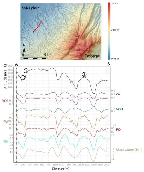 Plot of the topographic section, AB, across the northwestern slope of the Embagai crater, associated with values of VO, VOP, VON, SVF, PO, TPI, and mean curvature (using a 10-pixel radius, except for mean curvature, which uses a 5-pixel radius, as it is better adapted to the study area). The altitude in meters is represented in black, VO in blue, VOP in purple, VON in green, SVF in orange, PO in red, TPI in light blue, and mean curvature in light brown.