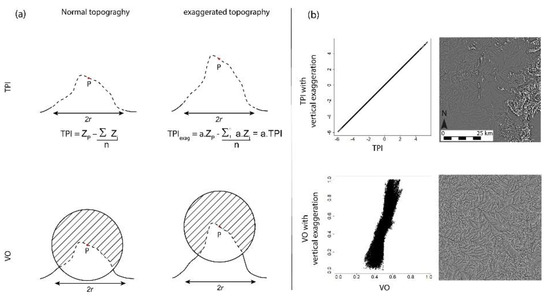 The TPI and VO methods, without exaggeration and with exaggeration, applied on part of the Tanzanian DEM. (a) Theoretical topographic profiles, without exaggeration and with x 2 exaggeration, for TPI and VO; (b) Scatterplots without exaggeration vs. with exaggeration (a = 1000), and resulting DEM.