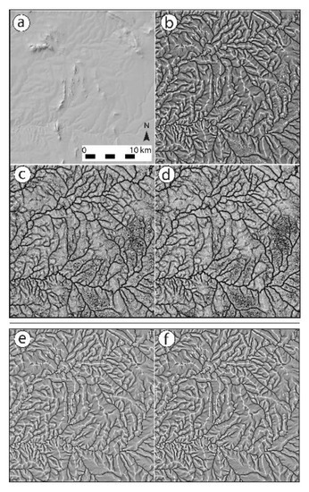 The hydrologic network of the Serengeti plain provides another example to demonstrate the capabilities of vertical exaggeration applied before VO calculation (Figure 10). Analytical hill-shading was processed without exaggeration to facilitate good understanding of the topography (Figure 10a), while a factor of 1000 was applied before computing VO, SVF, and PO (Figure 10b–d), with a 10-pixel radius, and without pre-smoothing or noise removal. The hydrologic network is revealed whatever the approach, and the valley bottoms are well marked in all cases, as expected. However, the VO image is crisper with narrower talwegs (Figure 10b). The SVF and PO rasters exhibit a more pronounced salt-and-pepper effect, due to the greater sensitivity of these algorithms to noise, as mentioned above (Figure 10c,d). Hu et al. (2021) [16] suggested using changes in aspect (namely PACV) to quantify concavity and convexity from DEMs, thus better identifying ridges and valleys. Here, PACV was computed using a modified version of the Python scripts made available by Hu et al. (2021) at https://github.com/NJNU-DTA/PACV (accessed on October 2020) (Figure 10e). Interestingly, an equivalent output can be obtained with the VO algorithm, when the DEM is adequately smoothed and exaggerated (Figure 10f). As PACV is not scale dependent, exaggeration has no effect on its output, whereas VO can be freely tuned using exaggeration for more versatility.