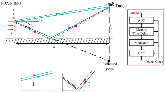 Advances in digital radio frequency memory (DRFM) technology have contributed to the development of jamming technology. The jammer stores the radar signal and subsequently generates the jamming signal using phase, frequency, and time delay modulation. The generated deceptive targets are capable of modulating to any range bin and doppler cell. The scenario of a VHF-FDA-MIMO radar subjected to deceptive jamming is shown in Figure 2. It should be noted that the jammer only transmits jamming signals in the direction in which the radar signal is received. The scenario of a VHF-FDA-MIMO radar subjected to deceptive jamming is shown in Figure 2. It should be noted that the jammer only transmits jamming signals in the direction in which the radar signal is received. Thus, there are two paths for the jamming signal. Considering the time delay modulated by the jammer is , the propagation delay of deceptive targets are