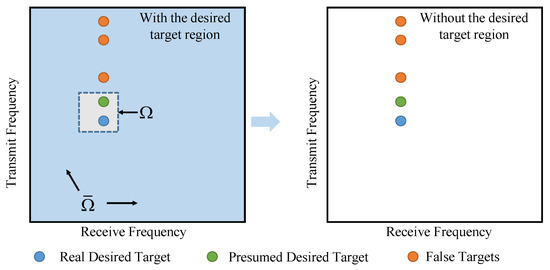 where represents the diagonal matrix with the array elements as diagonal lines. It can be directly observed from Equation (26) that the presence of prevents the location information of the true and false targets from being accurately represented in the covariance matrix. It means that the Capon spectrum reflecting the targets’ location cannot be obtained directly from the covariance matrix. Fortunately, the receiving frequency of the targets is often available in the scenarios facing range deceptive jamming. Thus, we can construct matrices . The covariance matrices processed by matrices and can be expressed as