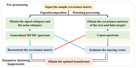 The generalized MUSIC algorithm utilizes the principle that the steering matrix is orthogonal to the noise subspace, which is a parameter estimation algorithm that is effective for coherent signals [1]. The generalized MUSIC algorithm uses the principle that the signal subspace is orthogonal to the noise subspace, and the signal subspace has the same space as the steering matrix. Thus, it enables obtaining the energy distribution of true and deceptive targets in the transmit–receive frequency domain in multipath scenarios, which can be used to reconstruct the interference plus noise covariance matrix (IPNCM). First, the generalized MUSIC spectrum can be expressed as