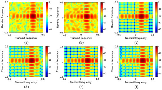 Transceive beampatterns of different method (without the desired target region). (a) Optimal, (b) LSMI, (c) GR-LSMI, (d) MR-LSMI, (e) GR-SVE, and (f) MR-SVE.