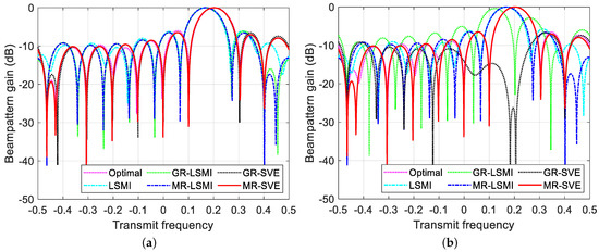 Since the true and false targets are distinguishable in the transmit frequency domain. To visualize more the performance of the beamformer under different a priori conditions, the cross-section of the beampattern in the transmit frequency domain is given. Figure 7a shows the different beampatterns with a SNR of 30 dB when the desired target region is known. In keeping with the above analysis, the beamformer with the direct LSMI method fails to generate null at the false target’s location. There is a significant mismatch in the method of reconstructing only the covariance matrix. The two methods with steering vector estimation processing effectively correct the pointing of the mainlobe. The beampattern cross-section lacking a priori information is given in Figure 7b. A serious self-cancellation phenomenon can be found for the two methods based on the generalized MUSIC reconstruction, which is the result of including the target signal into the covariance matrix together during the reconstruction of the full domain. However, the matching-based method still has excellent mainlobe conformality and interference suppression. The superiority of the method can be fully demonstrated.