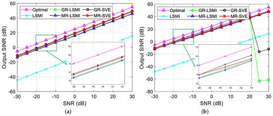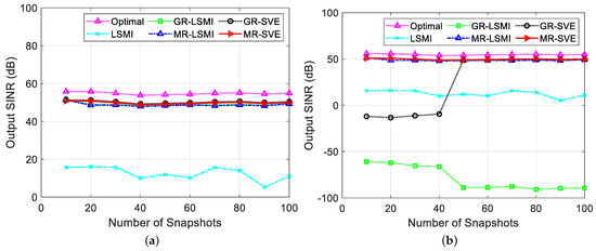 Output SINR versus the number of snapshots. (a) With the desired target region, (b) without the desired target region.