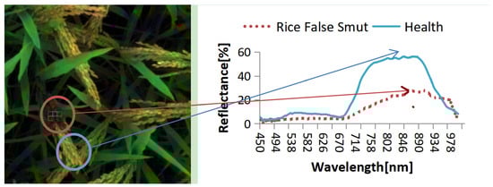 In the literature, many researchers have looked into the biological and chemical methods for RFS detection. For instance, Tang [] developed a nested polymerase chain reaction (PCR)-based assay to detect U. virens using the genes of U. virens as specific targets. The study might be conducted to detect infection by U. virens at an early stage—to look into how to mitigate disease spread and to study the ecology. To evaluate disease severity, Dhua [] presented a precise assessment method; a yield based on the florets and actual grains was simulated for the disease severity assessment of RFS disease. The above methods are relatively tedious. If a nondestructive and rapid method, e.g., remote sense, is used to detect RFS, it will be very convenient.