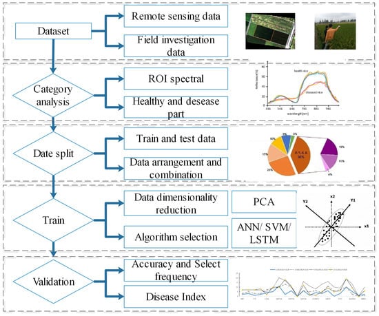 For RFS detection, there are various influencing factors affecting RFS detection in near earth remote sensing, such as different sowing dates and farm management types. In this study, to obtain a more convincing and generalized model for RFS detection, we considered the sowing data and farm management types; 14 paddy fields were prepared, including 7 different sowing dates and 2 different farm management types. The data were obtained using a frame-based hyperspectral image device, based on near earth remote sensing; 23 different differentiation tradition models were built to obtain the most useful model. Spectral based deep learning was also used for detection. Finally, the selected model was verified by actual field investigation results. Our specific objectives were: (1) to ensure differentiation between healthy ears of rice (HER) and disease ears of rice (DER) at different sowing dates and farm management types. (2) To develop different models and get the most reliable model. (3) To develop an appropriate structure of the spectral deep learning model. (4) To verify the model by actual field investigation results; the disease prescription map was generated. The workflow of this study is shown in Figure 1.