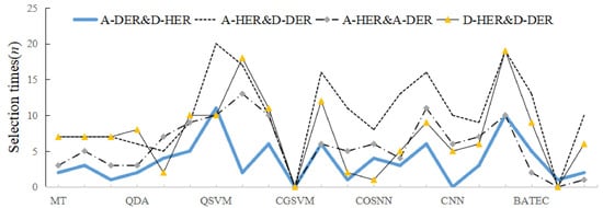 The differentiation methods between DER and HER among the different farm managements and sowing dates were analyzed. Among the arrangements, WNN was the most frequently used differentiation method for RFS analysis. Many researchers [] have already estimated various differentiation models; moreover, there are different opinions about which model is the most appropriate for DER and HER differentiation. This study used 23 discrimination methods, a very common algorithm at present, to detect all possible combinations, to ensure the effectiveness of the differentiation results obtained. Those combinations not only covered different farm management types, but different sowing periods. For each combination, there will be more than one method to get the highest accuracy, so the selection frequencies of all discrimination methods were counted, as shown in Figure 6. It is suggested that QSVM, WNN, and LSVM were the top-three highest accuracies for A-DER and D-HER; QSVM, WNN, and FSVM were the top-three for A-HER and D-DER; FSVM, MNN, and QSVM were the top-three for A-HER and A-DER; WNN, FSVM, and LSVM were the top-three for D-HER and D-DER. Generally, WNN and QSVM were the most selective and, therefore, these two methods could be considered the best among traditional models.