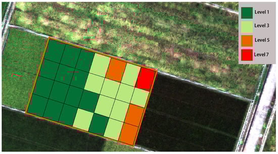 The disease grade of RFS, as the control group, was obtained through a field investigation. In this study, the RFS with different diseased grades were distinguished and counted according to the rice disease index. The incidence index of each area was calculated (Table 6). The incidence grade was divided into four grades 1, 3, 5, and 7, according to the disease index. The conditions corresponding to the disease index were DI < 1, 1 < DI < 3, 3 < DI < 5 and DI > 5. The classification of grades in this study was mainly based on the distribution gradient of the disease index.