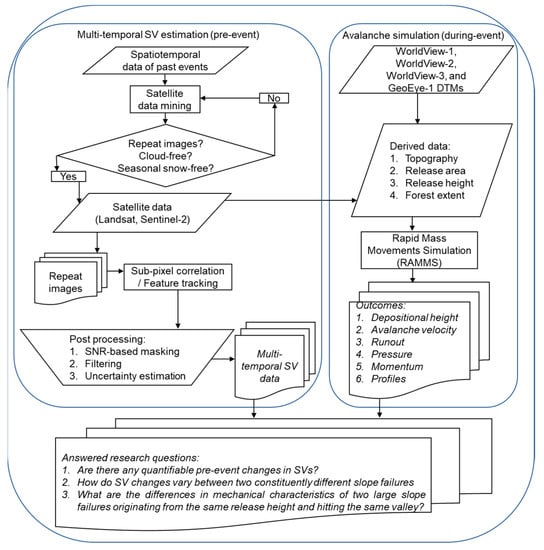 In addition to the high-resolution images obtained from Google Earth for visual analysis, we mainly used two remote sensing datasets for performing quantitative analyses: (1) multi-temporal satellite images for SV estimation and (2) high-resolution multi-temporal digital terrain models (DTMs) for Rapid Mass Movement Simulation (RAMMS) modelling. The details of these datasets are provided in Table 1. The image IDs of the satellite images used for visual analysis are provided in the respective figure captions. The overall workflow, designed to investigate the pre-event and during-event flow characteristics, is depicted in Figure 2.