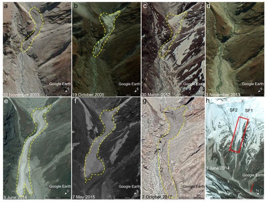 Multi-temporal (a–g) status of the avalanche deposition zone (dashed yellow polygon), right beneath the active slopes. The image in (e) shows a fresh avalanche and the image in (h) shows the seasonally active avalanche slope (red rectangle) below SF1 and SF2, with a long runout marked by the red arrow. Source: Google Earth images (Credit: CNES/Airbus).
