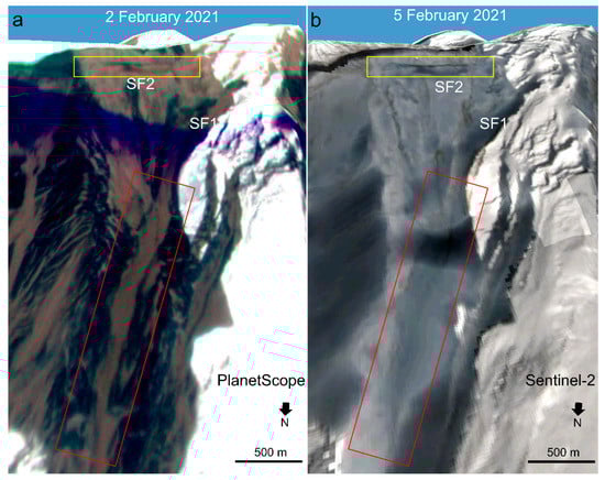 3D perspective views of the slope failure sites and the seasonal avalanche slope (red rectangle). The avalanche slope represents the same terrain as the red rectangle in Figure 5: (a) 2 February 2021 PlanetScope image [64]; (b) 5 February 2021 Sentinel-2 image. The yellow rectangle shows the developed indentation from where the major part of the hanging glacier broke on 7 February 2021, causing SF2. The images are contrast-stretched to counter the shadow and sensor saturation due to the snow. PlanetScope image ID: 20210202_052653_11_227c_3B; Sentinel-2 image ID: S2A_OPER_MSI_L2A_TL_VGS1_20210205T082130_A029374_T44RLU.