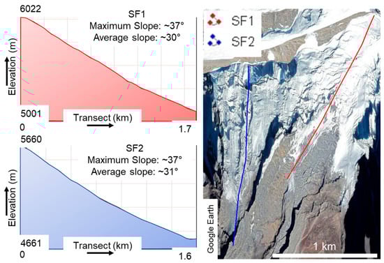 SF1 site (Figure 1 and Figure 3) appears to be a hotspot for ice avalanching from the same initiation zone. The maximum cross-sectional lengths and area of the broken part of the hanging glacier during SF1 were ~0.57 km (across the flow), ~0.92 km (along the flow), and ~0.28 km2, respectively. SF1 was a frontal block failure and the multi-temporal DTMs of 2021 and 2015 provided by Shugar et al. [21] helped us to estimate a volume of ~10 × 106 m3, corresponding predominantly to the glacier ice and possibly some seasonal snow. Using multi-temporal satellite images, we observed at least two major and comparable slope failure events at the SF1 site during the past two decades. These events were spaced ~16.5 years apart and they produced exactly the same indentation (Figure 3), marked by the dashed red curve in Figure 1c. For the earlier event, the 3D perspective views in Figure 3a depict the avalanched zone, and by using all the available Landsat images, we could narrow-down the timing of this event between January and April 2000. Similarly, the 3D perspective views in Figure 3b highlight the repetition of another avalanche (called SF1 in this paper) at the same indentation site. Using freely accessible Sentinel-2 and PlanetScope [64] images, we could narrow-down the timing of SF1 between 19 and 24 September 2016.