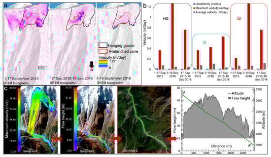 Surface velocity (SV) and RAMMS simulation for SF1: (a) 3D perspective views with overlaid short-term and long-term SVs. The Sentinel-2 image of 9 October 2016 (after SF1) is in the background. The SV colour ramp for all the time periods is adjusted to the same range (0–1.27 m/day) for visual comparisons; (b) detailed plots of SVs for the entire hanging glacier (i.e., HG), including its intact zone (IZ) and avalanched zone (AZ). For the IZ and the AZ, the SVs are also provided separately with associated uncertainties; (c) Rapid Mass Movement Simulation (RAMMS) modelling of SF1. The panel left-to-right shows the maximum velocity field, flow height and avalanche deposition zone, and the transect and respective avalanche deposit profile.