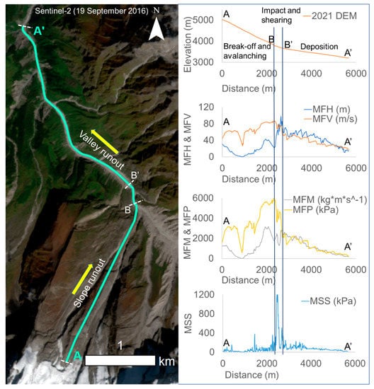 The RAMMS simulation further revealed the flow characteristic of this entire SF1 event (Figure 8 and Figure 9), which lasted for ~3 min as per the modelled results. Based on the mechanical characteristics, the event can be divided into three prominent phases (Figure 9): (1) break-off and avalanching in transect AB, (2) impact and shearing in transect BB’, and (3) deposition in transect B’A’. Overall, the maximum velocity, maximum flow height, and maximum pressure reached were ~90 m/s, ~100 m, and ~6000 kPa, respectively. The avalanching following the frontal break-off continued for ~2300 m before it struck the valley. The flow velocity, momentum, and pressure reached their peaks during this phase. Immediately after the impact, the maximum shear stress reached its peak (~1200 kPa), and this zone of ~200 m signifies the shearing and fragmentation of the ice core (Figure 9). Finally, a depositional analysis in RAMMS simulates the deposition zone within a ~3000 m length along the Ronti Gad stream (Figure 8c). The maximum deposition height is as much as ~48.10 m in the middle regions of the deposition zone (Figure 8c), highlighting the magnitude of the SF1 event. This also points towards the possibility that SF1 in 2016 and the previous event in 2000 might have preconditioned the valley significantly in terms of sedimentation availability and topographic smoothness, leading to the enormity of debris flow during SF2 in 2021. We further generated the deposition outline for SF1 and it remarkably matched the ice-debris extent observed in 9 October 2016 post-SF1 Sentinel-2 image. In the Himalayan context, the modelled flow characteristics and mechanical parameters are comparable to those reported for the Gyari glacier avalanche in the Shyok Basin of the Indus River, which killed 139 people [55]. The volume of the Gyari avalanche was 4.31 × 106 m3, as opposed to ~10 × 106 m3 of SF1, but the maximum height of the deposits reached as high as 40 m [55]. The difference between the simulated maximum pressure for Gyari (~2500 kPa) and SF1 (~6000 kPa) was also proportional to the mass difference between the two events [55].