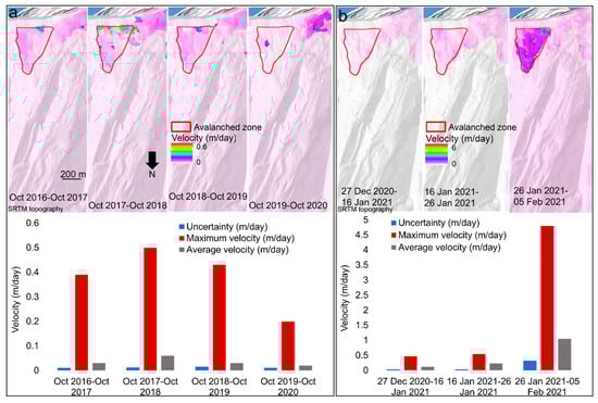 The uncertainty introduced due to possible orthorectification errors may result in some minor sub-pixel-scale horizontal shifts in the Landsat 8 and Sentinel-2 images. However, in case of imageries for the same path and row used within this study, the orthorectification uncertainties affecting SV estimations are negligible [49]. Eventually, for estimating the cumulative uncertainties in our SV estimates, we adopted the approach suggested by previous studies (e.g., [48,50]). We sampled all the pixels representing the stable terrain devoid of ice and vegetation. For these stable pixels, the overall mean and standard deviation of displacements were summed up and divided by the temporal separation of the correlated images to obtain the overall uncertainty per correlated scene-pair. The estimated uncertainties are provided in Table 2 and were of the same order of magnitude as reported by the previous studies (e.g., [48,50]), except for the last pair of 26 January 2021–5 February 2021, owing to extreme snow cover in 5 February 2021 image.