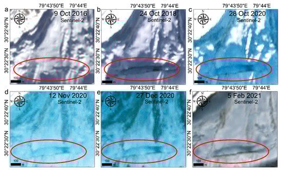 Multi-temporal (a–f) true colour composites (TCCs) of Sentinel-2 images showing the evolving break-off zone (red ellipses) for SF2.