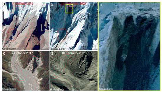 Pre-SF2 (a,c) and post-SF2 (b,d) images of the avalanche scar (zoomed-in view in (e)) and valley. The extent of coverage of SF1 deposits can be visualised by comparing (c,d). The red ellipse shows the spur that was obliterated by SF2. Source: Google Earth images (Credit: CNES/Airbus).