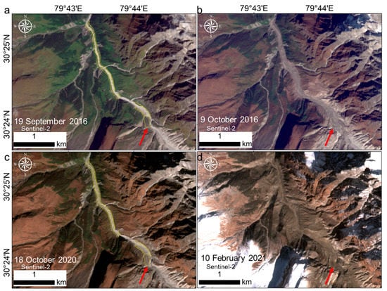 Temporal changes (a–d) in the SF1 deposition zone, as seen on Sentinel-2 images. Yellow outlines in the 18 October 2020 image highlight the regions along the channel, which significantly changed after SF1 and accumulated significant ice-debris deposits. Red arrows mark the avalanche slope. Sentinel-2 image IDs: S2A_OPER_MSI_L1C_TL_SGS__20160919T104034_A006494_T44RKU, S2A_OPER_MSI_L1C_TL_SGS__20161009T053631_A006780_T44RLU, S2A_OPER_MSI_L1C_TL_VGS1_20201018T072817_A027801_T44RLU, and S2B_MSIL1C_20210210T051939_N0209_R062_T44RLU.