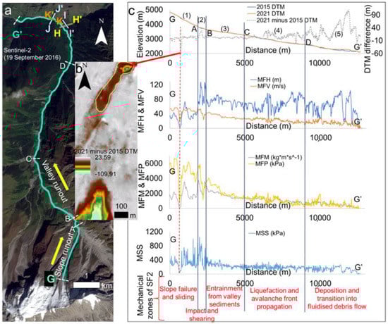 The maximum velocity reached by SF2 was ~65 m/s, while most of the flow height remains below 120 m (Figure 16). These values also correspond well with other studies; Shugar et al. [21] reported flow height of up to 120 m and the maximum velocity of 60 m/s for this event, while Jiang et al. [22] modelled the maximum flow height of 100 with the maximum velocity of 65 m/s. The maximum pressure reaches ~6000 kPa, while the momentum reaches ~4000 kgms−1 in the GG’ transect (Figure 16). Based on the modelled mechanical characteristics, SF2 as a rock-ice avalanche can be divided into five prominent phases before it turns into a more fluidised debris flow in Dhauliganga River (Figure 16): (1) slope failure and sliding as slope runout (initial ~1800 m of transect GG’, i.e., GA); (2) impact and shearing (~1800–~2400 m of transect GG’, i.e., AB); (3) entrainment from valley sediments (~2400–~5000 m of transect GG’, i.e., BC); (4) liquefaction and rock-ice avalanche front propagation as valley runout (~5000–~8900 m of transect GG’, i.e., CD); and (5) deposition, detrainment, and transition into a more fluidised debris flood (~8900–~12,500 m of transect GG’, i.e., DG’).
