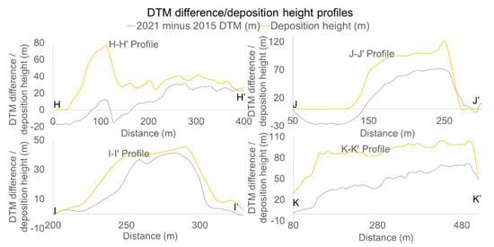 The last phase of SF2 is marked by the deposition of transported material between ~8900 and ~12,500 m of transect GG’, i.e., section DG’. Transect HH’ in Figure 16 represents the place where Ronti Gad meets Rishiganga River and, from this point onwards, a vast volume of sediments and rocks were deposited, temporarily damming the river and forming a ~700 m long lake [21]. A deposition analysis in RAMMS resulted in the total deposition volume of ~15 × 106 m3. The maximum flow height reached up to ~120 m. While Shugar et al. [21] also reported the maximum deposition height in the same range, based on DTM differencing, they reported the total deposition volume of ~8 × 106 m3, between the Ronti Gad–Rishiganga River confluence and point G’ in Figure 16. There are two reasons why our deposition volume is larger: (1) we observed and quantified the deposition on a larger stretch of transect GG’, i.e., DG’, and (2) our deposition estimates are in real-time, representing the terrain just after the rock-ice avalanche stopped at point G’. Figure 17 clarifies this point further. The 2021 post-SF2 DTM was generated using stereopairs acquired on 10 and 11 February and, by then, a significant volume of deposits fluidised and escaped as the debris flood. After 24 h of the event, the sediment plume could be seen on satellite images ~150 km downstream of the source, and ~80 times of the normal turbidity could be observed ~500 km downstream within 8 days of the event [21]. This means that the deposited avalanche material continuously kept on fluidising, contributing to a constant, albeit gradually diminishing, debris flow. To evaluate our modelled deposition results, we hypothesised that while DTM difference elevations would show lower deposition heights, considering that they were generated using 10/11 February stereopairs, the profile pattern should match our modelled deposition heights. When we performed the profile analysis along four transects in the deposition region (Figure 16), we found that there was a remarkable similarity between the profile patterns between the modelled curve representing the deposition height immediately after the SF2 event on 7 February and the DTM difference curve representing the terrain on 11 February (Figure 17). This further proved the authenticity of our simulated results.