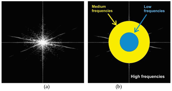 Figure 2a shows the two-dimensional spectrum of an image, and Figure 2b shows the regions of the two-dimensional spectrum that correspond to the low-, medium-, and high-frequency components of the original image [28,29]. The magnitude of the vector (u,v) gives a frequency, and its direction gives an orientation in the two-dimensional spectrum. The function is a sinusoid with this frequency along the direction, and constant perpendicular to the direction. So, if there is a periodic characteristic in a direction in the original image, its response in the wavenumber domain will be a spectral streak in the orthogonal direction in the two-dimensional spectrum, as illustrated below.