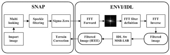 Due to fact that all processing was carried out in the Windows environment, the IDL routine was necessary to be applied (bytes inversion); if the Linux environment were to be used, the IDL routine step would not be necessary, which would simplify the processing. If the SNAP program incorporates FFT filtering tools in the future, the entire processing chain could be carried out simultaneously, simplifying the execution.