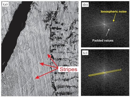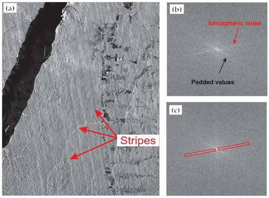 (a) ALOS/PALSAR-2 scene, HH polarization, image with stripes; (b) 2D image spectrum image; (c) 2D image spectrum with the corresponding stop-band filtering window in red.