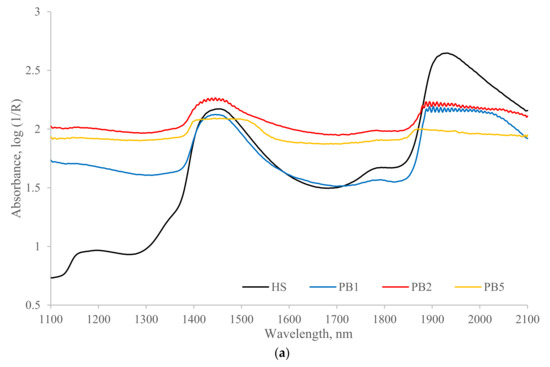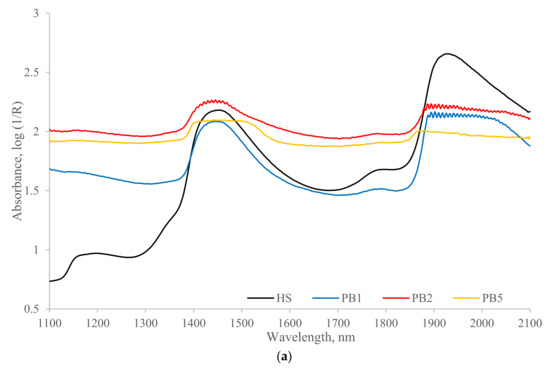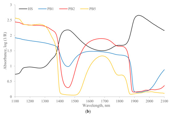 The performances of the transflectance probe with three configurations of different optical path lengths were evaluated for manure samples of both NH4-N and Org-N spiking groups. The averaged raw spectra of transflectance configurations PB1 and PB2 showed high noise level at 1900–2100 nm which indicated most light was blocked and that the NIR measurement was not accurate beyond 1900 nm (Figure 1a and Figure 2a). Moreover, the noise level of PB2 was higher than the PB1 at approximately 1450 nm. The light was completed blocked and broad peaks at 1450 nm and 1950 nm were not observed in the spectrum of PB5 in Figure 1 and Figure 2, which indicated the absorbance measured by PB5 was not accurate. According to the NIR calibration results, the transflectance probe with the shortest optical path length (PB1) presented the most accurate predictions of manure constituents, including NH4-N, Org-N, and TS, among the three path lengths (Table 4 and Table 5). The performances of PB1 for predicting ash and PS were similar to PB2 and PB5. An explanation of this result could be that with a longer path length, the light travels through more solution and is absorbed, and this would increase the absorbance and have less light transmit through the sample. Consequently, the spectrum of PB1 configuration which has the shortest pathway is less saturated compared to PB2 and PB5 with longer pathways during the NIR measurements, resulting in a better predicted utility.