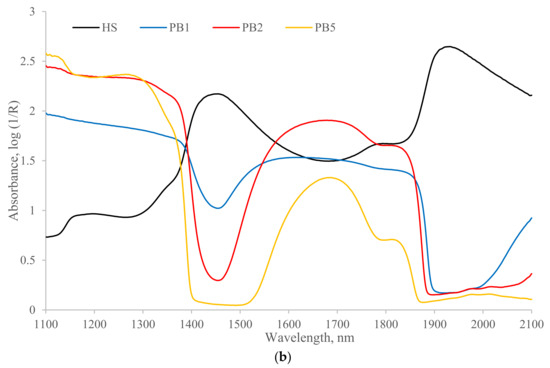 (a) Averaged spectrum of 100 samples in NH4-N spiking group scanned by one-reflec-tance and three-transflectance sensor configurations. The spectrum of PB1, PB2, and PB5 were converted to pure white reference. (b) Averaged spectrum of 100 samples in NH4-N spiking group scanned by one-reflectance and three-transflectance (PB1, PB2, PB5) sensor configurations. The spectrum of PB1, PB2, and PB5 refer to DDI water.