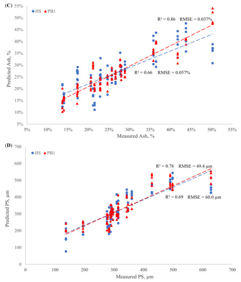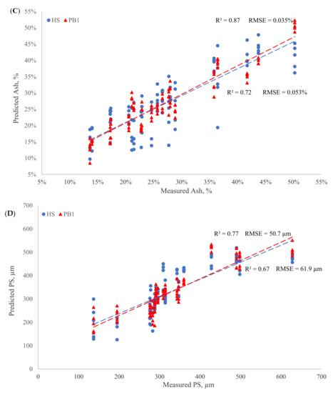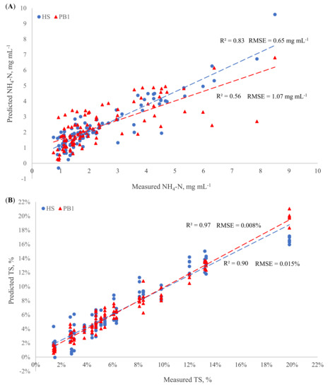 The R2 and RMSE of transflectance PB1 were 0.97 and 0.008% in the NH4-N spiking group, respectively (Table 4), which indicated that the accuracy of TS predictions was excellent, and the calibration was usable in any applications (RPD = 5.50). Although TS predicted by the reflectance HS was less accurate than the PB1, it provided good quantitative prediction with an R2 of 0.90 and an RMSE of 0.015%. The HS predicted ash and PS approximately; the R2 and RMSE were 0.66 and 0.057% for ash, and 0.69 and 60.0 µm for PS, respectively (Table 4). The R2 and RMSE values of 0.86 and 0.037% for ash content and 0.78 and 49.4 µm for PS, respectively, indicated the transflectance PB1 was better than the reflectance HS in predicting ash and PS in manure samples of the NH4-N spiking group (Table 4). The calibration evaluations of reflectance and transflectance modes for TS, ash, and PS in the Org-N spiking group were all similar to the results in the NH4-N spiking group that the transflectance PB1 (TS: R2 = 0.97, RMSE = 0.009%; ash: R2 = 0.87, RMSE = 0.035%; PS: R2 = 0.77, RMSE = 50.7 µm) presented a better performance than the reflectance HS (TS: R2 = 0.90, RMSE = 0.015%; ash: R2 = 0.72, RMSE = 0.053%; PS: R2 = 0.67, RMSE = 61.9 µm) for predicting TS, ash, and PS, respectively (Table 5).