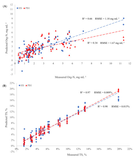 Therefore, the reflectance HS had a better performance than the transflectance probe for predicting NH4-N and Org-N concentrations. Both the reflectance and transflectance provided excellent calibration accuracy for TS, however the transflectance probe was more accurate than the reflectance sensor. The transflectance probe had a better performance than the reflectance sensor for predicting ash content and PS.