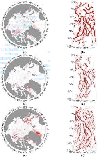 In this section we compare the detected sea ice leads from the AMSR2 data on 3 April 2013 with the three sea ice lead products from the MODIS data (Figure 3). Specifically, we zoom in on the Beaufort Sea to illustrate the details of the derived sea ice leads because that sea ice exhibits strong rheological features in the Beaufort Sea, such as sea ice ridges and leads. The detected sea ice leads with a lead fraction less than 1% in the AMSR2 data are negligible since these leads may come from noise on the daily map. Only completely identified sea ice leads from the MODIS dataset are taken into calculation; potential sea ice leads are excluded.