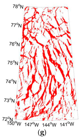 Basically, the derived sea ice leads in the AMSR2 data (Figure 3a) show similar patterns to those in the HD (Figure 3c) and WHD (Figure 3e) products, that is, sea ice leads are prevalent in the Beaufort Sea, Kara Sea, Greenland Sea, and Baffin Bay. The WHD product presents more sea ice leads than the HD product in the Beaufort Sea, Kara Sea, and Greenland Sea. In the Beaufort Sea, the derived sea ice leads in the AMSR2 data (Figure 3b) generally represent typical sea ice geometry, which is identified in the three MODIS datasets (Figure 3d–g). Owing to the relatively coarser resolution in the AMSR2 data, the three MODIS sea ice lead products exhibit finer regional variations. To further quantitatively validate our results these MODIS products have been resampled and remapped with a nearest-neighbor technique to match our product. Statistical comparison shows that the derived AMSR2 sea ice leads in the Beaufort Sea on 3 April 2013 capture 46.91%, 47.53%, and 40.06% of the leads shown in the HD, WHD, and QD products. Since the cloud masks in the three MODIS data are different, these values are acquired after the removal of the AMSR2 grid points, which are covered by cloud in the corresponding MODIS product. These values are comparable with the value of 50% of lead detection for AMSR-E data [24].